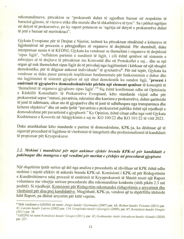 Dokumenti sjellë në vëmendje edhe konstatimet e Raportit për vendim të Bashkimit Evropian, përkitazi me procedurat e zhvilluara në KPK i cili thekson zhgënjimi për mungesën e drejtësisë, transparencës dhe parimeve të meritës në procedurën e përzgjehdjes së Kryeprokurorit nga ana e KPK-së.