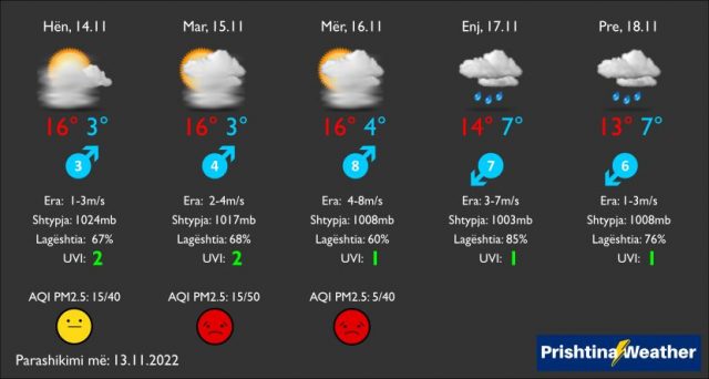 13.11.2022 – Java e dytë e nëntorit, parashihet të filloj me mot stabil dhe kryesisht me diell, megjithëse orëve të mëngjesit me kushte për mjegull përgjatë ultësirave.