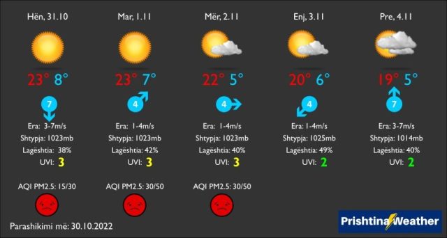 Sipas Prishtina Weather, temperaturat minimalet luhaten ndërmjet 4C deri 8C, e ato maksimale ndërmjet fillimisht kapin vlera edhe deri në 23C, me rënie graduale deri në 19C ditën e premte.