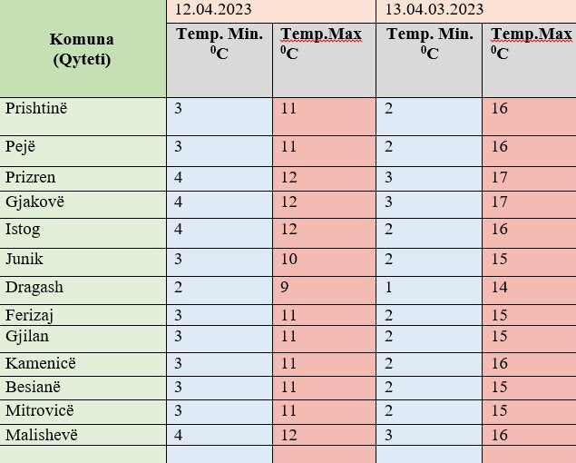 Temperaturat minimale do të lëvizin ndërmjet 1 dhe 3 gradë, ndërsa maksimalet do të jenë ndërmjet 14 dhe 17 gradë Celsius.