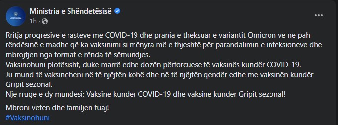 “Rritja progresive e rasteve me COVID-19 dhe prania e theksuar e variantit Omicron vë në pah rëndësinë e madhe që ka vaksinimi si mënyra më e thjeshtë për parandalimin e infeksioneve dhe mbrojtjen nga format e rënda të sëmundjes”, thuhet në postimin e MSH-së.