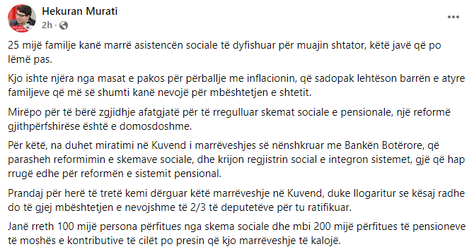 “Për këtë, na duhet miratimi në Kuvend i marrëveshjes së nënshkruar me Bankën Botërore, që parasheh reformimin e skemave sociale, dhe krijon regjistrin social e integron sistemet, gjë që hap rrugë edhe për reformën e sistemit pensional. Prandaj për herë të tretë kemi dërguar këtë marrëveshje në Kuvend, duke llogaritur se kësaj radhe do të gjejë mbështetjen e nevojshme të 2/3 të deputetëve për tu ratifikuar”, ka shkruar ai.