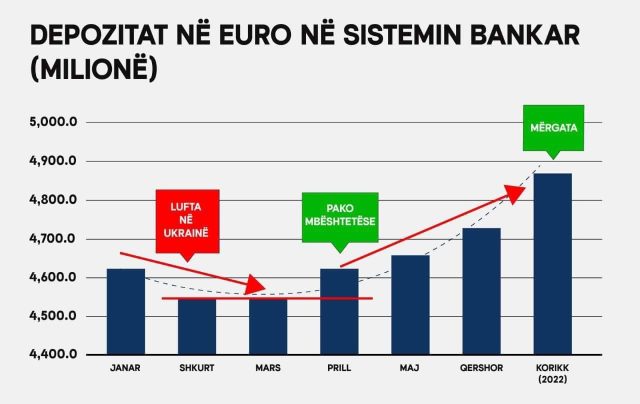 ?Siç mund të shihet nga grafiku më poshtë, në fillim të vitit kishte një rënie të theksuar të nivelit të depozitave si rezultat i luftës që nisi në Ukrainë. Për shkak të rritjes së çmimeve e rrezikut të mbylljes së kufijve, qytetarët e bizneset nxituan të furnizoheshin me mallëra, gjë që shkaktoi një rënie të nivelit të likuiditetit në ekonomi.