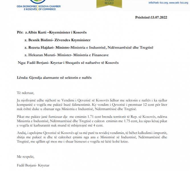 Kryetari i Shoqatës së naftarëve të Kosovës, Fadil Berjani i ka dërguar një letër kryeministrit Albin Kurti dhe vartësve të tij, duke i kërkuar rishqyrtimin e vendimit lidhur me sektorin e naftës që sipas tij i ka sjellë kompanitë e vogla me pakicë buzë falimentimit.