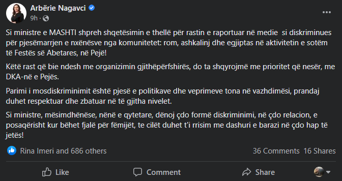 Si ministre e MASHTI shpreh shqetësimin e thellë për rastin e raportuar në medie si diskriminues për pjesëmarrjen e nxënësve nga komunitetet: rom, ashkalinj dhe egjiptas në aktivitetin e sotëm të Festës së Abetares, në Pejë!