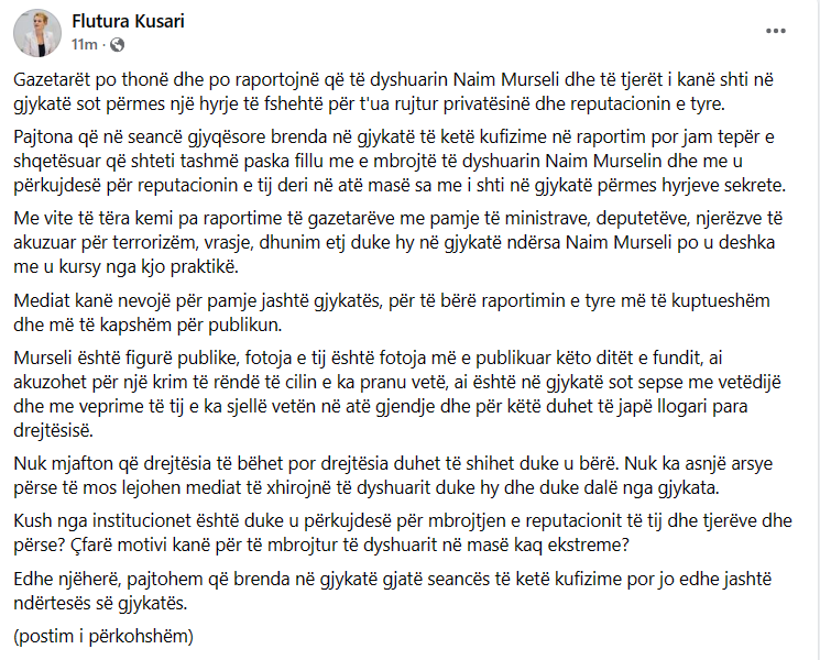“Gazetarët po thonë dhe po raportojnë që të dyshuarin Naim Murseli dhe të tjerët i kanë shti në gjykatë sot përmes një hyrje të fshehtë për t’ua rujtur privatësinë dhe reputacionin e tyre. Pajtona që në seancë gjyqësore brenda në gjykatë të ketë kufizime në raportim por jam tepër e shqetësuar që shteti tashmë paska fillu me e mbrojtë të dyshuarin Naim Murselin dhe me u përkujdesë për reputacionin e tij deri në atë masë sa me i shti në gjykatë përmes hyrjeve sekrete”, ka shkruar Kusari në llogarinë e saj në Facebook.