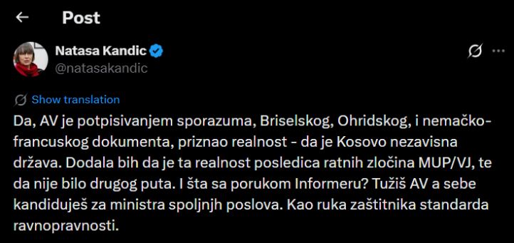 “Po, duke nënshkruar Marrëveshjen e Brukselit, Marrëveshjen e Ohrit dhe dokumentin gjermano-francez, AV (Aleksandar Vuçiq) ka pranuar realitetin – se Kosova është një shtet i pavarur. Do të shtoja se ky realitet është pasojë e krimeve të luftës nga MUP/J i Serbisë”, shkroi ajo.