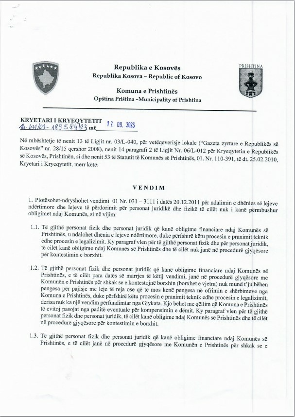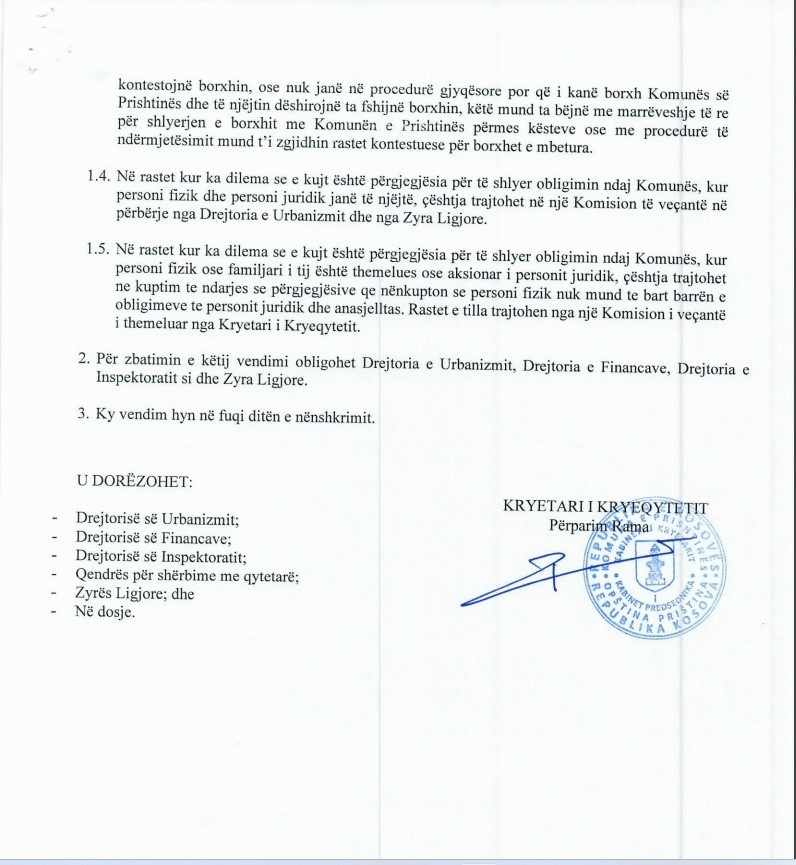 Kryetari i Komunës së Prishtinës, Përparim Rama e ka nënshkruar vendimin që e ndalon dhënien e lejeve ndërtimore për ata persona që u kanë borxh komunës.