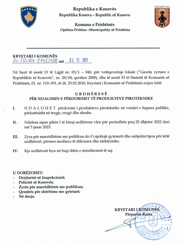 Përmes një njoftimi në faqen zyrtare në Facebook, Komuna e Prishtinës ka bërë të ditur se ndalohet përdorimi i produkteve piroteknike në vendet e hapura publike, përkatësisht në tregje, rrugë dhe sheshe..