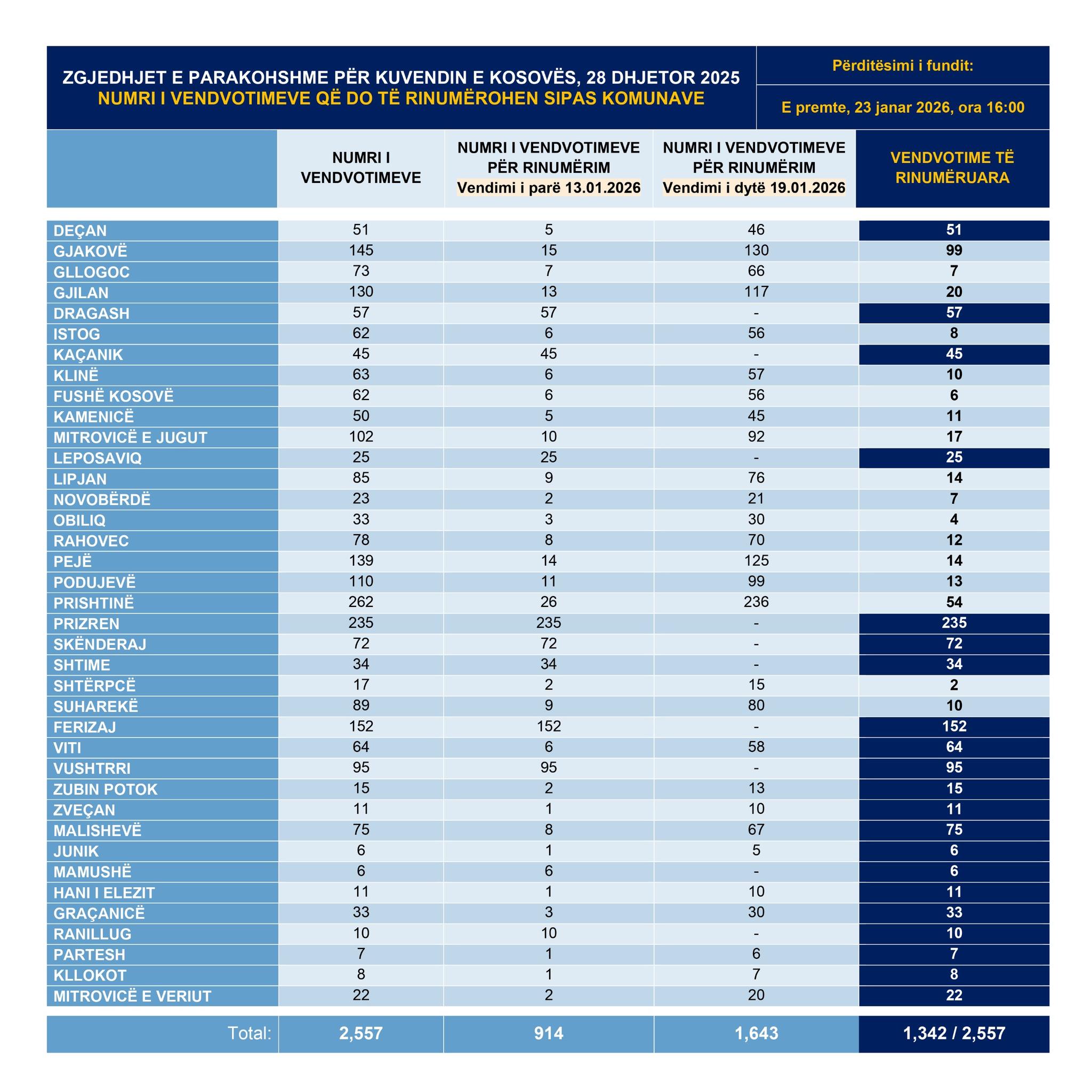 Që nga fillimi i procesit më 13 janar 2026, deri më 23 janar 2026, janë rinumëruar 1,342 nga 2,557 vendvotime, ose mbi 52% e totalit. Sipas të dhënave të fundit, rinumërimi është përmbyllur plotësisht në 21 komuna.