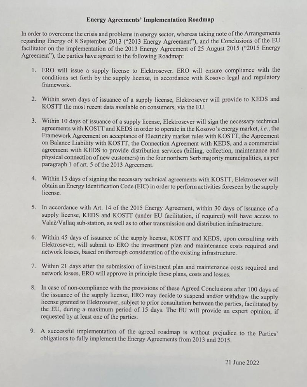 3. Brenda 10 ditëve nga lëshimi i licencës për furnizim, Elektroseveri do të nënshkruajë teknikalitet e nevojshme të marrëveshjes me KOSTT-in dhe KEDS-in për të operuar në tregun energjetik të Kosovës, d.m.th. Marrëveshja Kornizë për pranimin e rregullave të tregut të energjisë elektrike me KOSTT-in, Marrëveshja mbi Detyrimin e Bilancit me KOSTT-in, Marrëveshjen e Kyçjes me KEDS-in dhe një marrëveshje komerciale me KEDS-in për ofrimin e shërbimeve të distribucionit (faturimi, arkëtimi, mirëmbajtja dhe lidhja fizike e konsumatorëve të rinj) në katër komunat veriore me shumicë serbe, sipas paragrafit 1 të Artikullit 5 të Marrëveshjes së 2013-s.