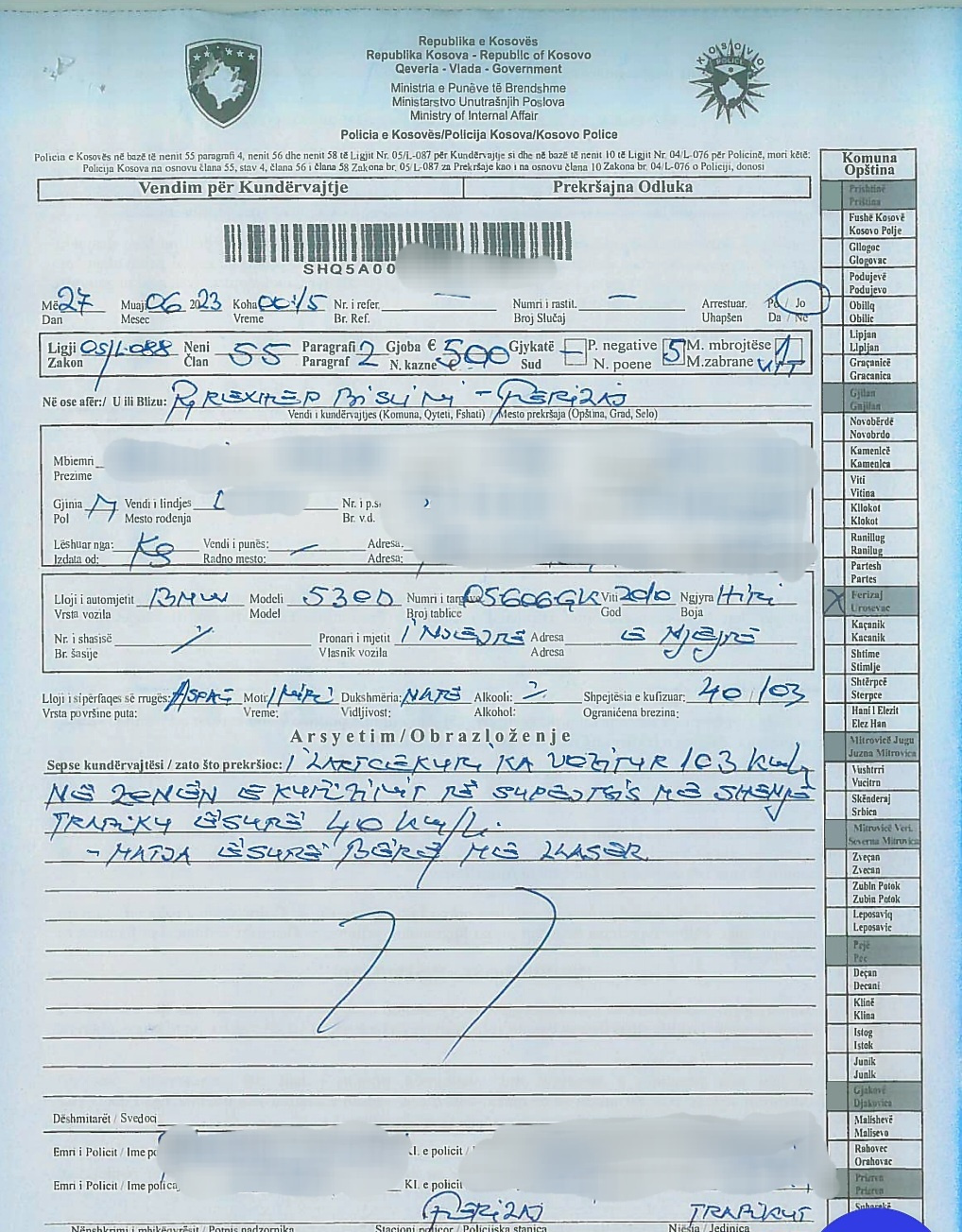 Policia Rajonale e Ferizajt ka ndaluar pas mesnatës një shofer 22 vjeçar, i cili me veturën e tij ka bërë tejkalim të shpejtësisë, ku në zonën e kufizimit 40 km/h ka zhvilluar shpejtësi 103 km/h.