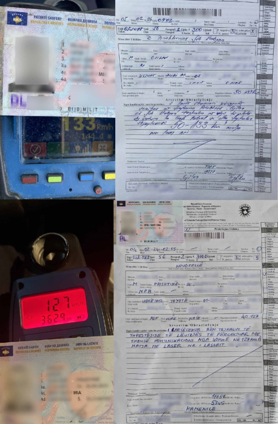 Njësite policore të Drejtorisë rajonale të Policisë në Gjilan gjatë kontrolleve në trafik, kanë hasur në dy kundërvajtës, njëri në zonën ku kufizimi i shpejtësisë së lejuar është dyzet (40) km/h duke vozitur me shpejtësinë njëqind e njëzet e shtatë (127) km/h dhe tjetri në zonën ku kufizimi i shpejtësisë së lejuar është pesëdhjetë (50) km/h duke vozitur me shpejtësinë njëqind e tridhjetë e tri (133) km/h.