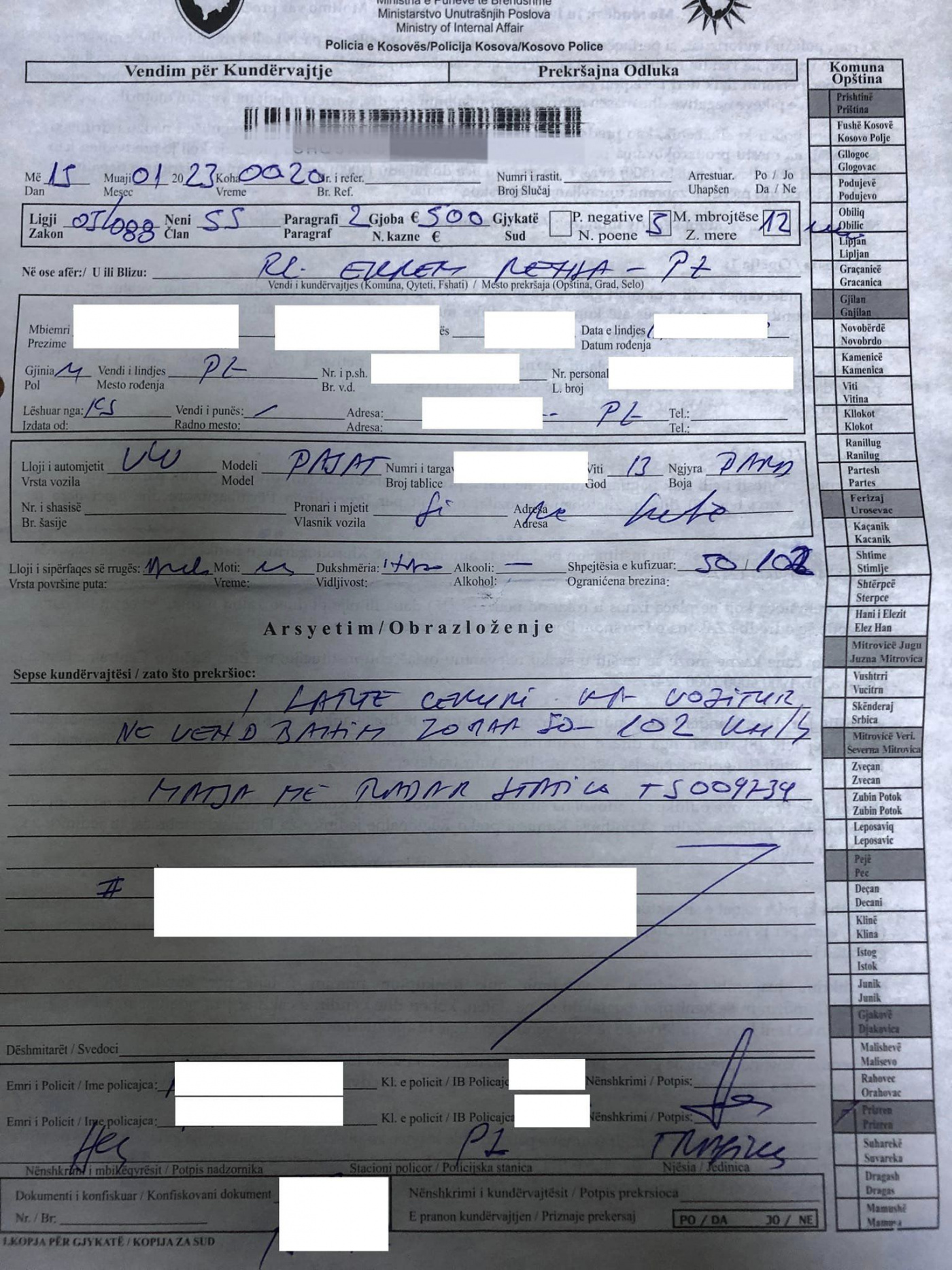 Bashkangjitur gjeni foto nga gjobat e shqiptuara nga Njësisë Rajonale të komunikacionit Rrugor në Prizren, për gjobën për tejkalim shpejtësie zone urbane 50/102 km h, thuhet tutje në njoftimin e policisë. /arbresh.info/
