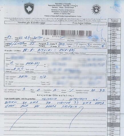 Ndaj tij policia i shqiptoi një gjobë kundërvajtëse sipas ligjit të komunikacionit rrugor me dënim 300 euro, 3 pikë negative dhe 6 muaj masë mbrojtëse, heqje e patent shoferit./Arbresh.info/