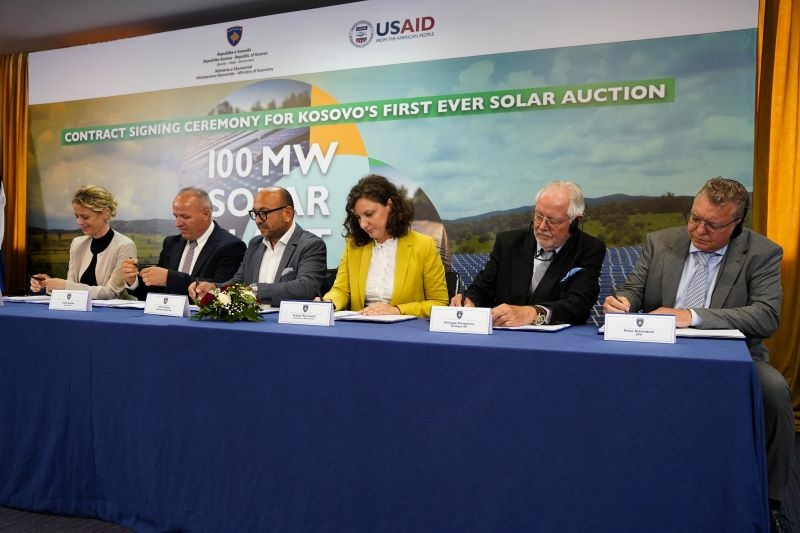 Ministrja e Ekonomisë, Artane Rizvanolli sot ka nënshkruar marrëveshjen për zhvillimin e projektit të ankandit të parë solar të vendit me kompaninë tashmë të themeluar në Kosovë “Lindja Solar” nga konsorciumi fitues i ankandit i përbërë nga “Orllati Groupe” nga Zvicra, “Holdigaz” nga Zvicra, “ZPV” nga Gjermania dhe “Jaha Solar” nga Kosova.