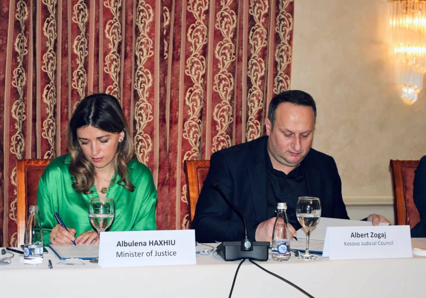 Ministrja e Drejtësisë, Albulena Haxhiu, sot ka marrë pjesë në ceremoninë e nënshkrimit të Memorandumit të Mirëkuptimit në mes të Këshillit Gjyqësor të Kosovës dhe Avokaturës së Shtetit, që ka për qëllim rritjen e efikasitetit dhe cilësisë së shërbimeve të gjykatave dhe gjithashtu, rritjen e transparencës dhe bashkëpunimit.