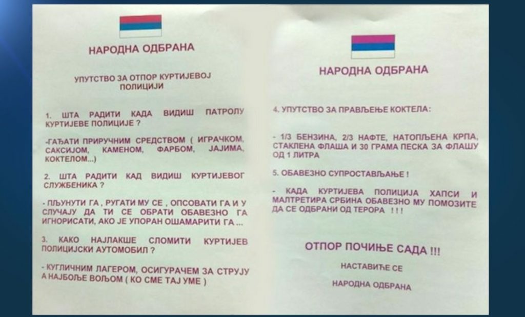Fletëpalosjet e nënshkruara nga “Mbrojtja e Popullit”, të cilat janë shpërndarë në kanale të ndryshme Telegram, përmbajnë gjoja udhëzime për rezistencë ndaj policisë së Kosovës. Në këto fletëpalosje ndër të tjera thuhet se policia e Kosovës duhet vënë në shënjestër me çdo mjet, se policët duhet të pështyhen dhe të shahen. Më pas shkatërroni makinat e policisë me çdo mjet dhe udhëzim se si të përgatisni koktej molotovi dhe të ngjashme.