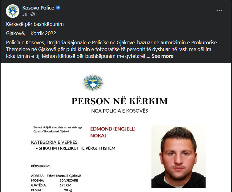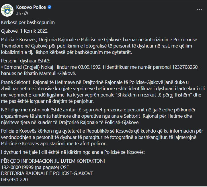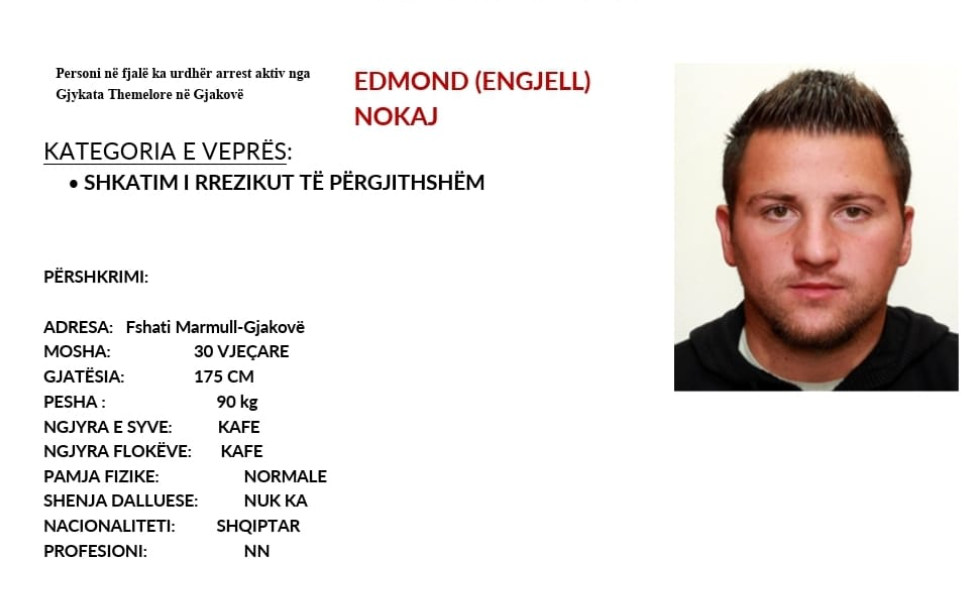 “Personi i dyshuar është Edmond (Engjell) Nokaj i lindur me 03.09.1992, i identifikuar me numër personal 1232708260, banues në fshatin Marmull-Gjakovë. Pranë Sektorit Rajonal të Hetimeve në Drejtorinë Rajonale të Policisë-Gjakovë janë duke u zhvilluar hetime intensive ku gjatë veprimeve hetimore është identifikuar i dyshuari i lartcekur i cili me veprimet e kundërligjshme ka kryer veprën penale ‘Shkaktim i rrezikut të përgjithshëm’ dhe me pas është larguar në drejtim të panjohur”, thuhet në njoftim, bënë të ditur policia.