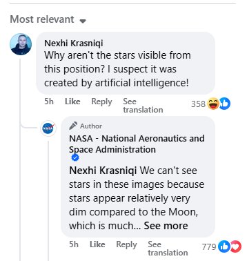 Në postimin ku paraqiteshin pamje të realizuara nga anija kozmike Orion gjatë fluturimit rreth anës së fshehtë të Hënës, qytetari nga Kosova pyeti pse nuk duken yjet në fotografi dhe sugjeroi se pamjet mund të ishin krijuar nga inteligjenca artificiale.