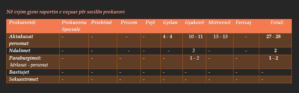 Prokurori i Shtetit ka njoftuar opinionin publik se gjatë 24 orëve të fundit nga prokuroritë themelore janë ngritur 27 aktakuza kundër 28 personave për vepra të ndryshme penale, shkruan arbresh.info.