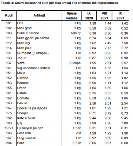 “Bukë dhe drithëra me 1.5 për qind, mish me 1.9 për qind, qumësht, djathë e vezë me 7.7 për qind, vajra dhe yndyra ushqimore me 28.2 për qind, perime me 19.7 për qind, sheqer, reçel, mjaltë, çokollatë dhe ëmbëlsira me 2.1 për qind, pijet alkoolike me 3.8 për qind, duhan me 2.7 për qind, gaz me 10.6 për qind, lëndë djegëse të ngurta, dru zjarri, pelet me 4.6 për qind, karburantet dhe lubrifikantë për pajisjet e transportit personal me 26.7 për qind, shërbime për transport me 2.2 për qind, shërbime telefonike dhe të telefaksit me 20.3 për qind, pushime të organizuara turistike me 8.9 për qind, shërbime hoteliere me 2.3 dhe shërbime financiare me 6 për qind”, thuhej në raport.