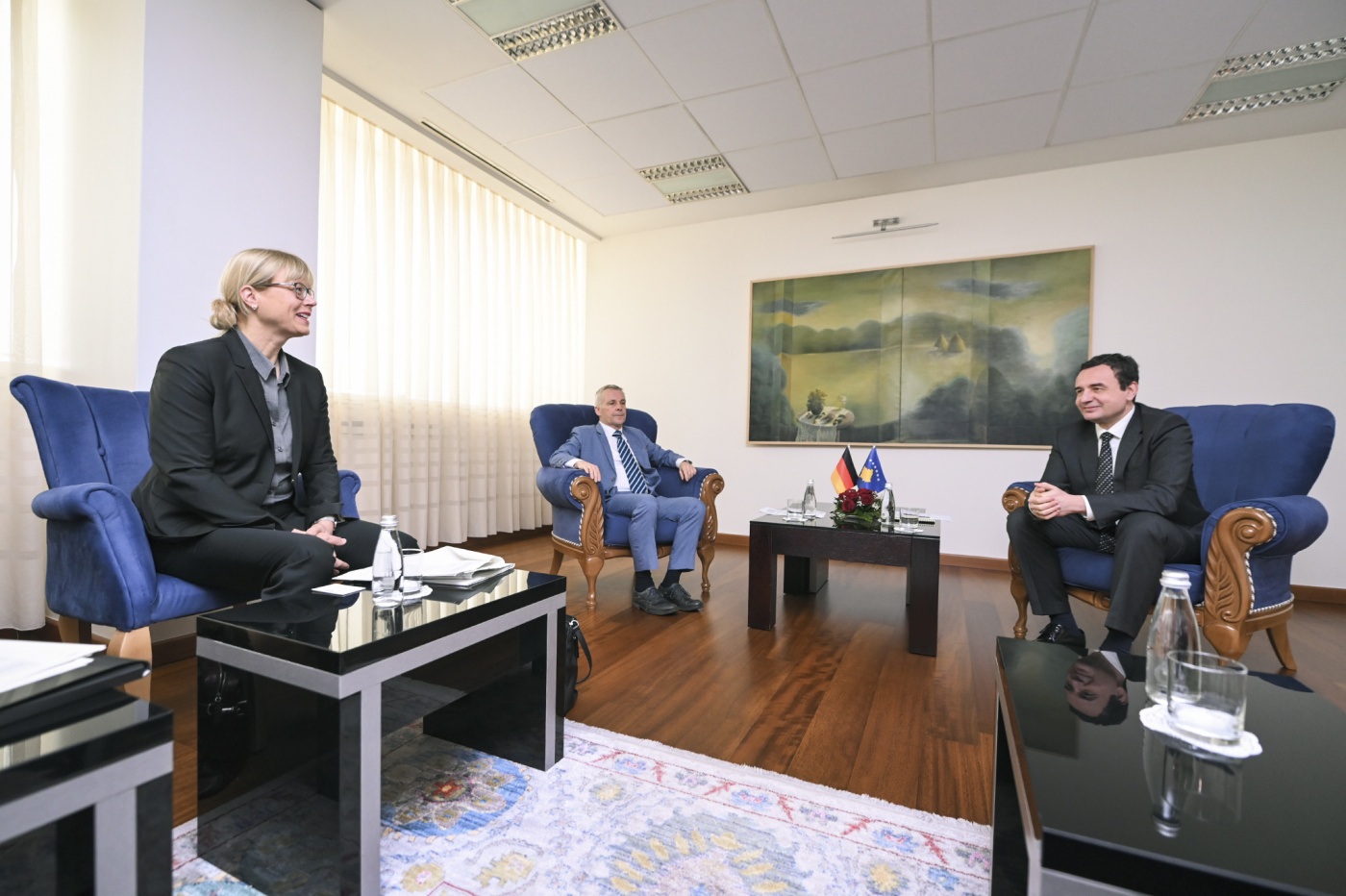 Kryeministri i Republikës së Kosovës, Albin Kurti, ka pritur në takim Drejtoren e Përgjithshme të Fondacionit Gjerman për Bashkëpunim Juridik Ndërkombëtar (IRZ), Frauke Bachler, Drejtorin për Evropën Juglindore të IRZ-së, Frank Hupfeld dhe ekspertët Doktorin e Shkencave të Drejtësisë, Stefan Trunk dhe Thomas Seidel, të dy me përvojë shumëvjeçare në prokurori, respektivisht polici dhe njësi të inteligjencës financiare në Gjermani, të shoqëruar nga Ambasadori i Gjermanisë në Kosovë, Joern Rohde.
