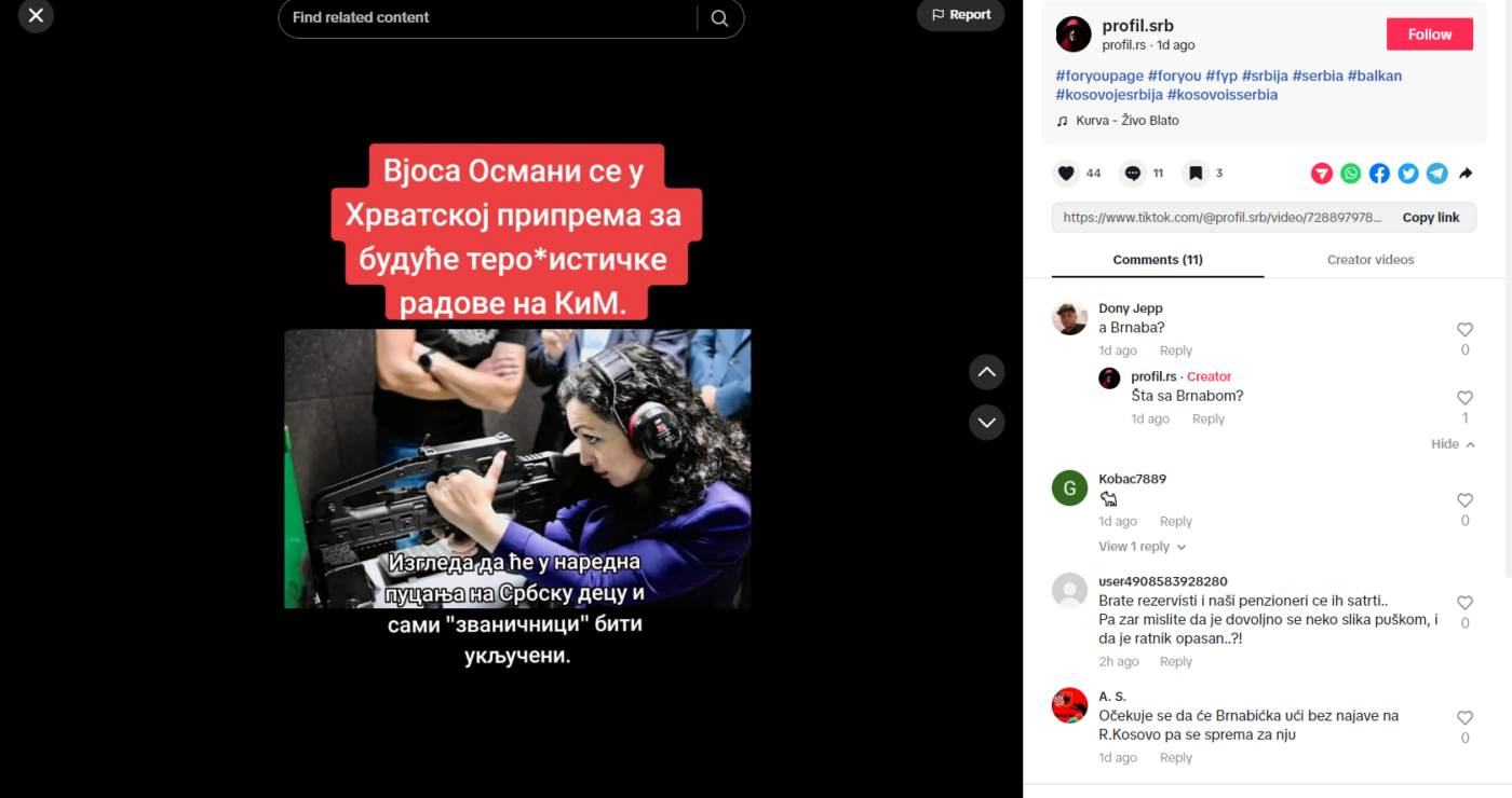 Mbi këtë fotografi shkruan “Vjosa Osmani po përgatitet në Kroaci për aktivitetet e ardhshme terroriste në Kosovë”, duke e përcjell me një këngë në sfond, ku përdorën fjalët më të rënda./Arbresh.info/
