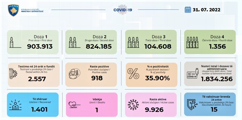 Ministria e Shëndetësisë bëri të ditur se gjatë 24 orëve të fundit në Kosovë janë regjistruar edhe 918 raste të reja me coronavirus, dhe një rast i vdekjes.