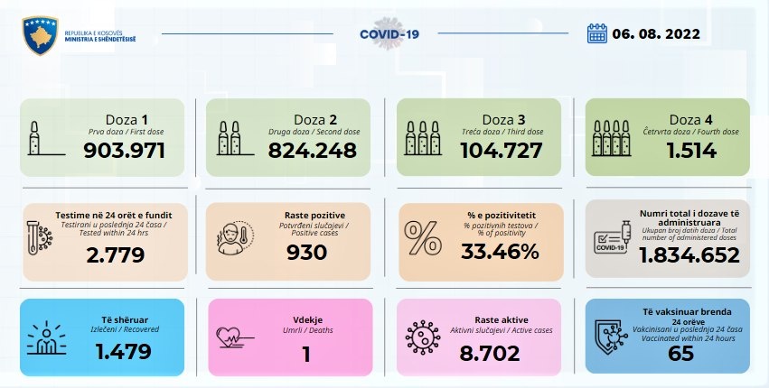 Nga 2779 testime të bëra, Ministria e Shëndetësisë njofton se 930 qytetarë janë infektuar me Covid-19.