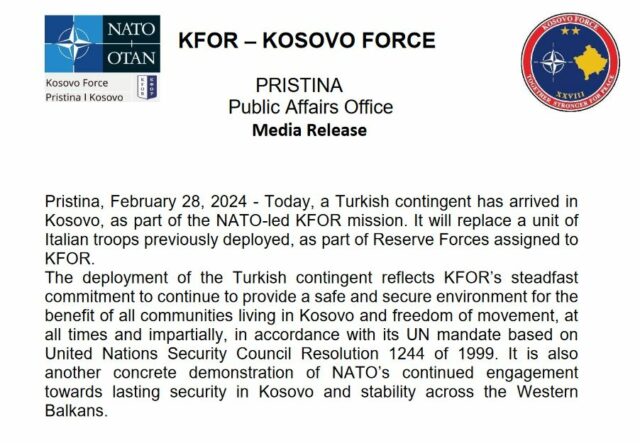 “Dislokimi i kontingjentit turk pasqyron përkushtimin e palëkundur të KFOR-it për të vazhduar të ofrojë një mjedis të sigurt dhe të sigurt për të mirën e të gjitha komuniteteve që jetojnë në Kosovë dhe lirinë e lëvizjes, në çdo kohë dhe në mënyrë të paanshme, në përputhje me mandatin e tij të OKB-së bazuar në Sigurinë e Kombeve të Bashkuara. Rezoluta e Këshillit të Sigurimit, e vitit 1999. Është gjithashtu një demonstrim tjetër konkret i angazhimit të vazhdueshëm të NATO-s drejt sigurisë së qëndrueshme në Kosovë dhe stabilitetit në të gjithë Ballkanin Perëndimor”, thuhet në njoftimin e KFOR-it./Arbresh.info/