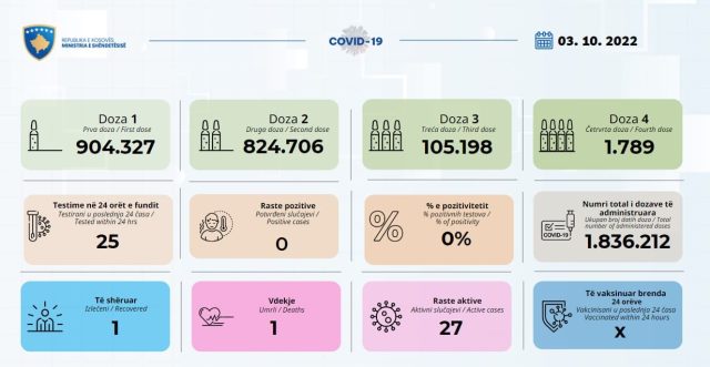 Sipas raportit 24 orësh, nuk është regjistruar asnjë rast i ri me COVID-19 ku janë kryer 25 testime.