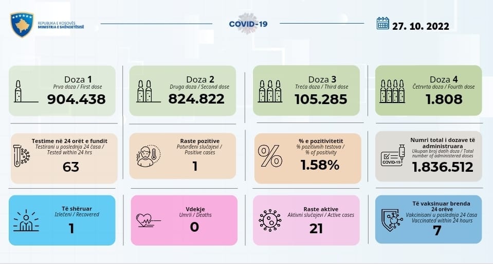 Ministria e Shëndetësisë ka njoftuar se gjatë 24 orëve të fundit është vetëm një rast pozitiv me COVID-19.