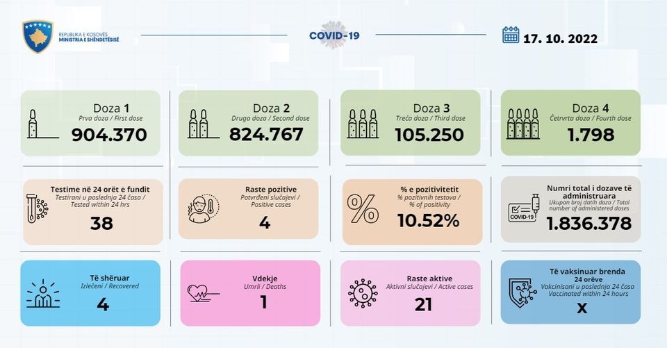 Janë shëruar katër persona, si dhe janë 21 raste aktive me COVID-19, ka njoftuar ministria./arbresh.info/