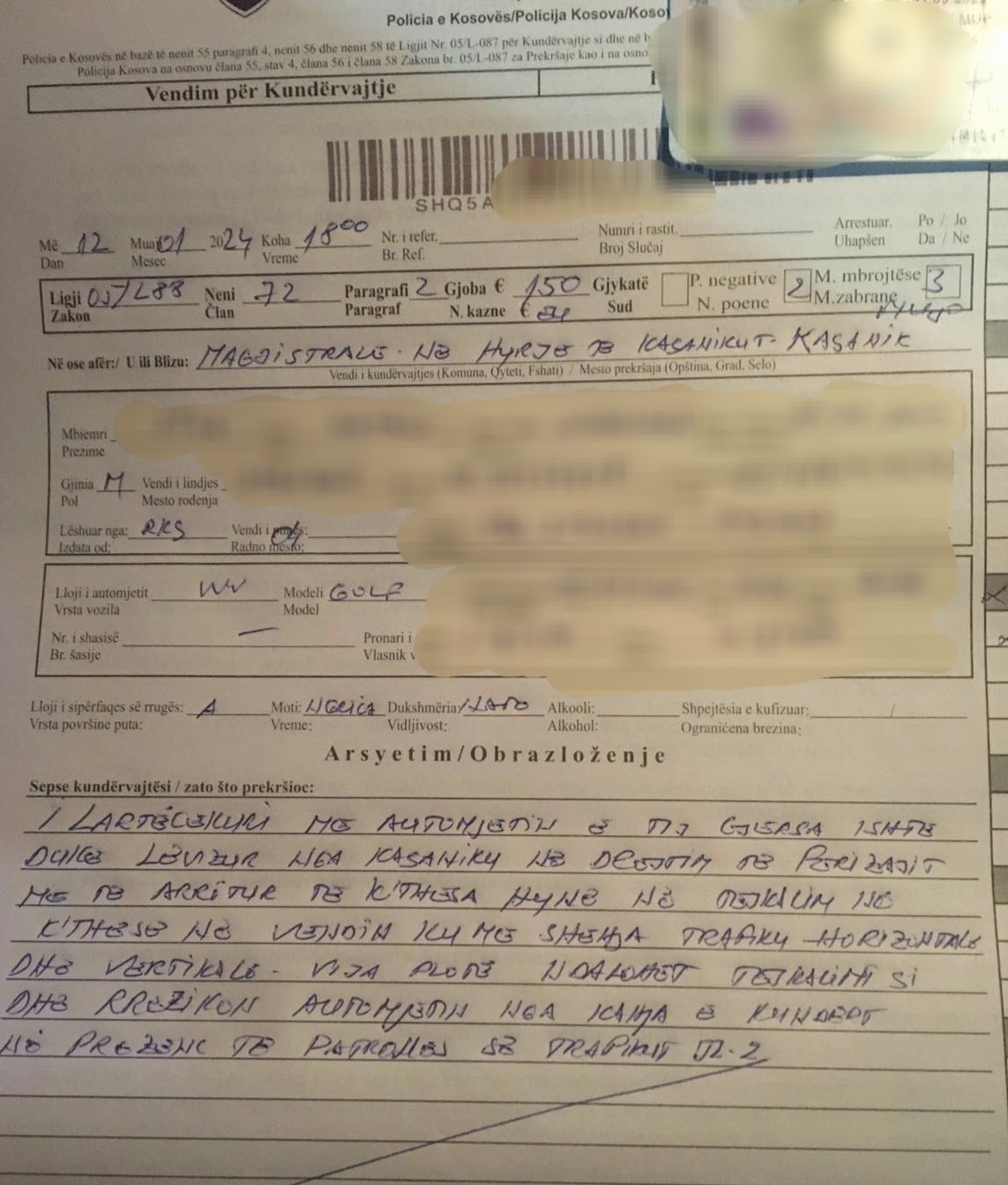 Ndërsa, në ora 18:00 në rrugën magjistrale Ferizaj-Kaçanik, në hyrje të Kaçanikut, policia ka ndaluar shoferin A.L (M/K) i moshës 23 vjeçar, i cili me veturë ka bërë tejkalimin në vijë tē plotë dhe për këtë policia i shqiptoi një gjobë për kundërvajtje 150 euro, 2 pikë negative dhe 3 muaj masë mbrojtëse, heqje e patentë shoferit, shkruan Arbresh.info