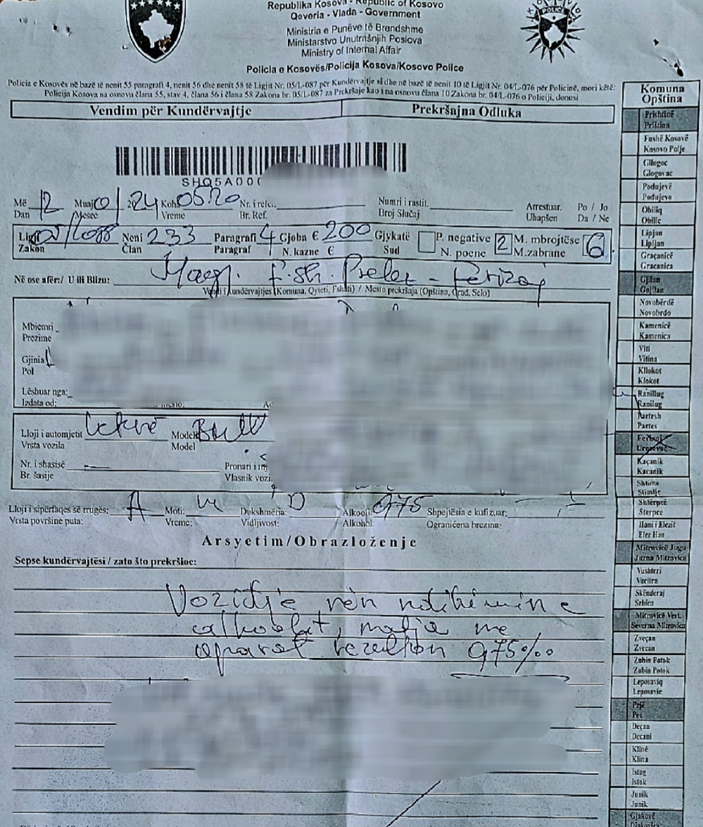siç njofton Policia sot( e premte) në orën 05:20 në rrugën magjistrale Ferizaj -Prishtinë, në fshatin Prelez ka ndaluar shoferin F.A (M/K) i moshës 38 vjeçar, i cili ka drejtuar veturën nën ndikim të alkoolit, ku pas testimit me alkooltest ka rezultuar 0.75 promila dhe për këtë policia i shqiptoi gjobën prej 200 euro, 2 pikë negative dhe 6 muaj masë mbrojtëse, heqje e patentë shoferit.