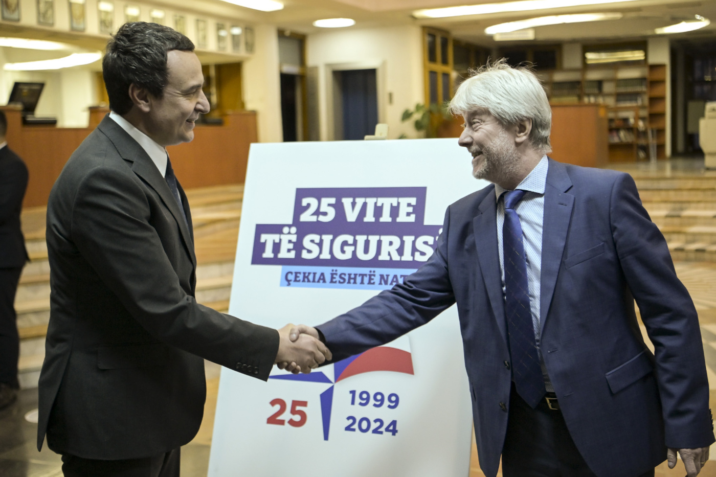 Kryeministri i Republikës së Kosovës, Albin Kurti, mbrëmë mori pjesë në hapjen e ekspozitës të titulluar “Njëzet e pesë vjet të Republikës së Çekisë në NATO”, që u mbajt në Bibliotekën Kombëtare “Pjetër Bogdani”, në Prishtinë, për ta shënuar kështu 25-vjetorin e anëtarësimit të Republikës së Çekisë në NATO.