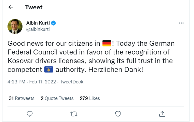 Kurti përmes një postimi në Twitter, ka shkruar se Këshilli Federal Gjerman ka votuar pro, duke treguar besimin tek autoriteti kompetent i Kosovës.