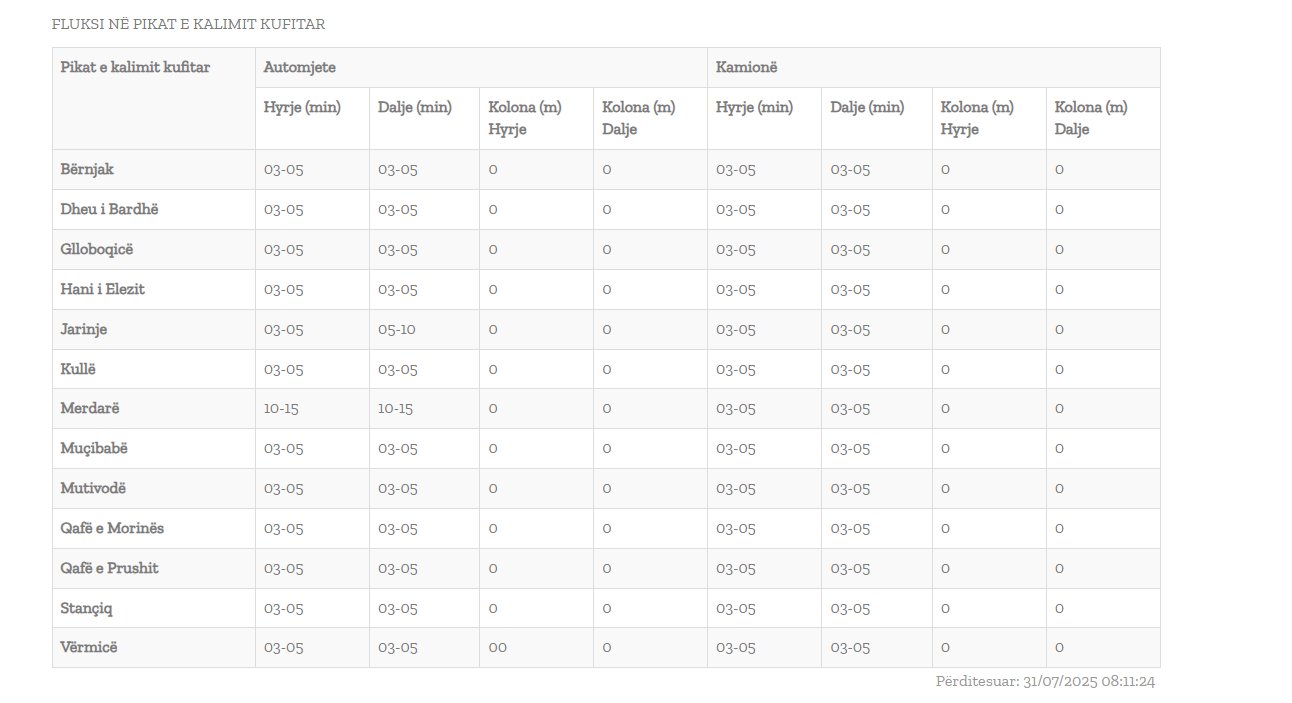 Sipas të dhënave të përditësuara të Qendrës Kombëtare për Menaxhim Kufitar, pritjet janë deri në 15 minuta.
