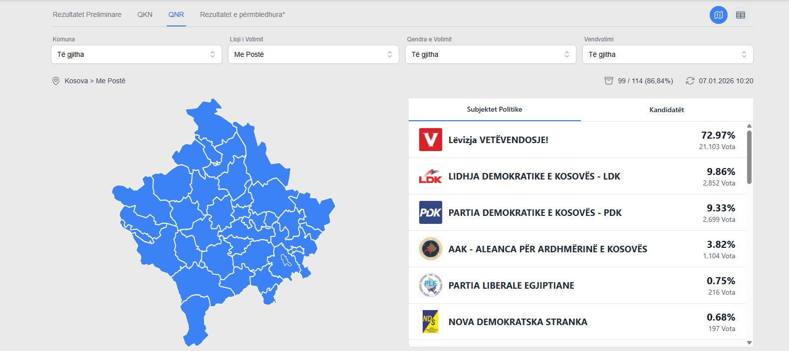 Sipas përditësimit të fundit të Komisionit Qendror të Zgjedhjeve (KQZ), deri më tani janë procesuar 86,84% e votave të ardhura me postë.