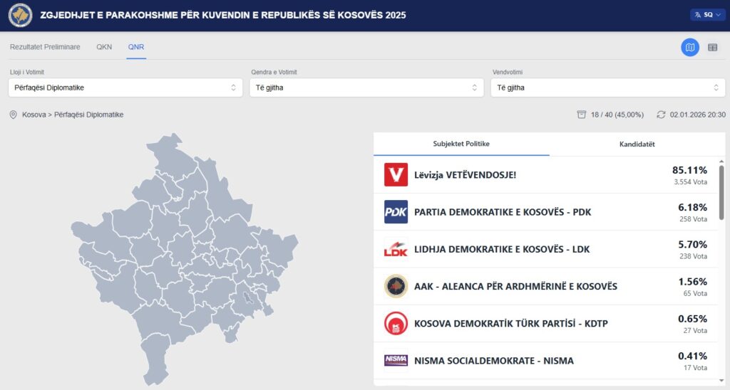 Më 27 dhjetor 2025, në 29 përfaqësitë diplomatike të Republikës së Kosovës, të vendosura në 18 shtete të ndryshme të botës, është zhvilluar votimi për shtetasit e regjistruar paraprakisht për të votuar fizikisht në ndonjërën nga këto misione diplomatike. Nga 19,187 shtetasit e regjistruar, kanë votuar 16,165 prej tyre apo 84.24%.