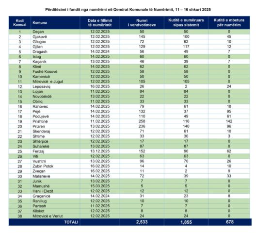 Procesi i numërimit do të vazhdojë ditën e martë, në 19 Qendra Komunale të Numërimit.