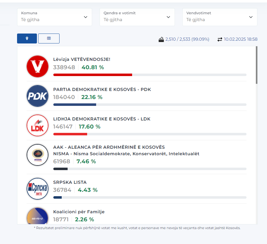 Lëvizja Vetëvendosje po prin me 40.81 për qind apo 338,948 vota të fituara në zgjedhjet parlamentare të 9 shkurtit.