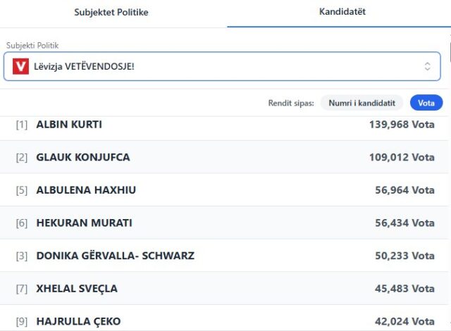 Sipas të dhënave të deritanishme kandidatët më të votuar në VV janë Albin Kurti, Glauk Konjufca, Albulena Haxhiu, Hekuran Murati e Donika Gërvalla.