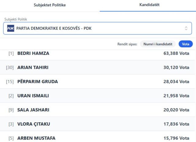 Në PDK pesë të parët janë Bedri Hamza, Arian Tahiri, Përparim Gruda, Uran Ismaili e Vlora Çitaku.
