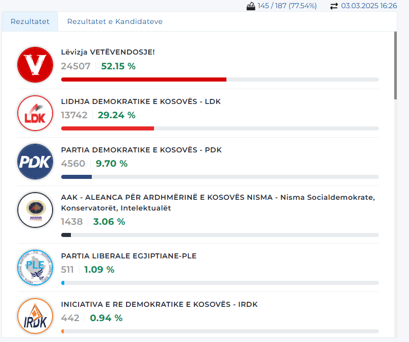 Pas numërimit të mbi 77 për qind të votave të dërguara me postë, Lëvizja Vetëvendosje prin me 52.15 për qind, e ndjekur nga Lidhja Demokratike e Kosovës me 29.2 për qind.