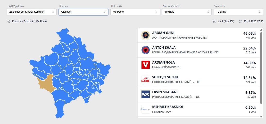 Kandidati i AAK-së për kryetar të kësaj komune, Ardian Gjini ka marrë 46.08% të votave, kurse pas tij renditet Anton Shala nga PSHDK me 22.64%, shkruan Reporteri.net.