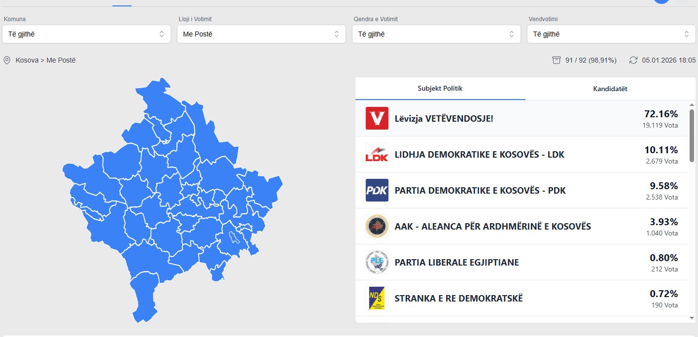 Bazuar në rezultatet e përmbledhura, ku përfshihen gjitha votat, LVV është e para me 50.66 për qind, PDK e dyta me 20.43%, dhe LDK-ja me 13.33%.