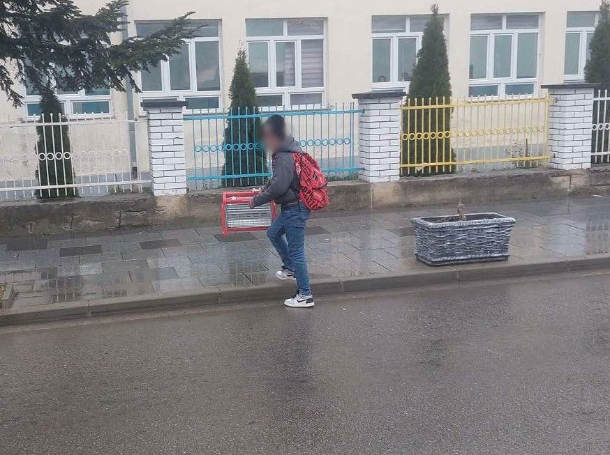 Një nxënës i shkollës fillore “Fetah Sylejmani” në Komunën e Dragashit është detyruar të shkojë në shkollë me një ngrohëse të vogël.