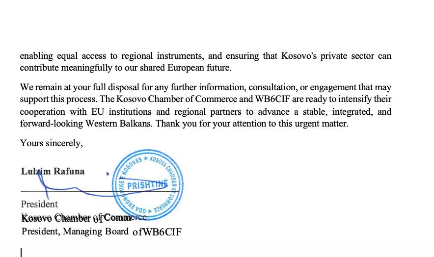 Oda Ekonomike e Kosovës, në letrën e shkruar ka kërkuar heqjen e këtyre masave për të mundësuar qasje të barabartë në instrumentet rajonale dhe për të garantuar që sektori privat i Kosovës të kontribuojë në të ardhmen evropiane të përbashkët.